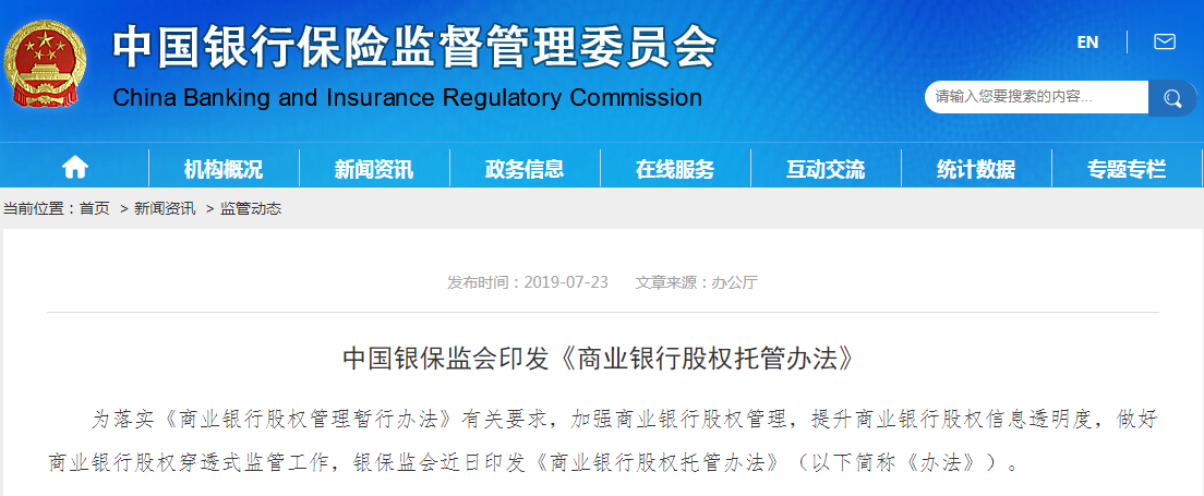 转载请标注:信息网——银保监会发布《商业银行股权托管办法》