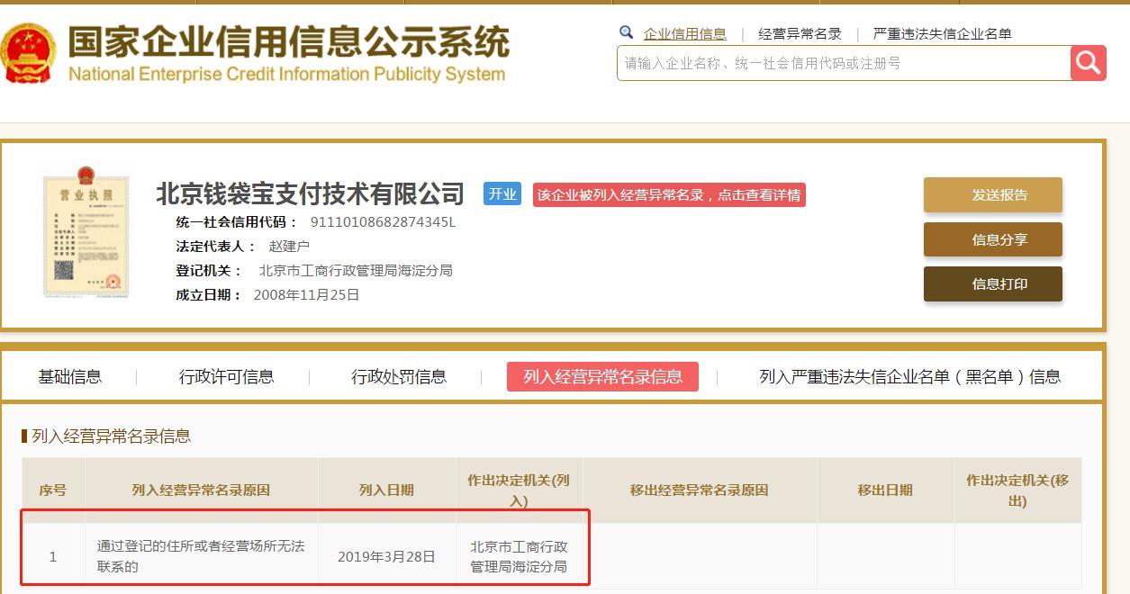 据国家企业信用信息公示系统显示,3月28日,钱袋宝运营主体“北京钱袋宝支付技术有限公司”因通过登记的住所或者经营场所无法联系,被北京市工商行政管理局海淀分局列入经营异常名录。