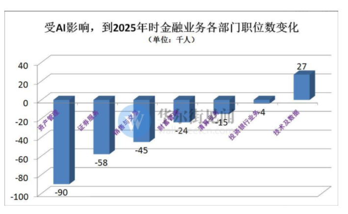 据金融咨询机构Opimas预计,到2025年,华尔街将有10%的投行岗位被AI取代,约23万人。其中,资产管理、证券服务、销售与交易、财富管理等业务部门,都将是重点“瘦身”对象。