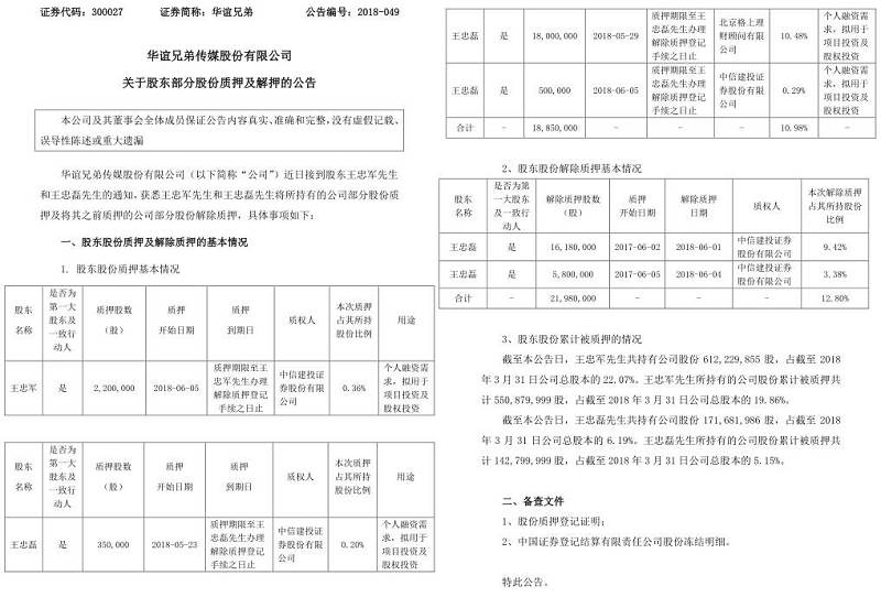 6月6日,华谊兄弟发布公告,公布华谊兄弟持股人王中军、王中磊的股份质押状况。