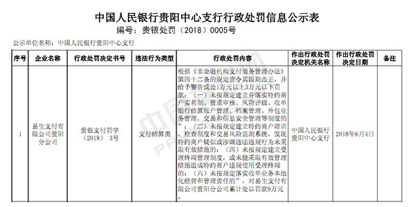 网络整理 2021-03-22 16:38中国人民银行贵阳中心支行2018年6月4日作出行政处罚决定,易生支付有限公司贵阳分公司涉及四项违规行为被合并处罚9万元。