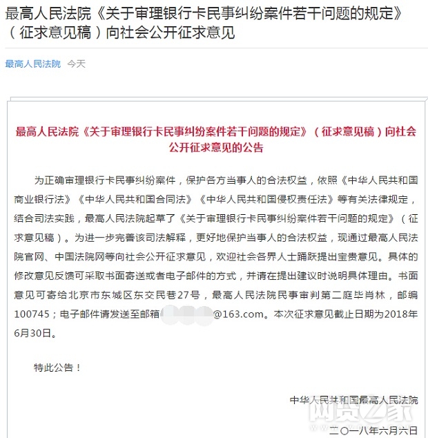 网络整理 2021-03-22 16:39网贷之家综合 6月6日,最高人民法院发布“《关于审理银行卡民事纠纷案件若干问题的规定》(征求意见稿)向社会公开征求意见的公告”,就最高人民法院起草了《关于审理银行卡民事纠纷案件若干问题的规定》(征求意见稿)向社会各界公开征求意见,本次征求意见截止日期为2018年6月30日。