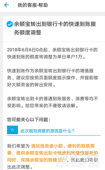 作为最大货币基金的余额宝官方发布公告表示:2018年6月6日起,余额宝转出到银行卡的快速到账(T+0日到账)额度,将由每日限额5万元调整为单日单户1万元。转出到银行卡的普通到账服务(T+1日到账)不受影响。