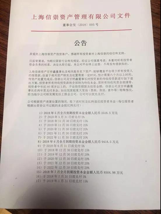 新浪财经获取的信崇资产公告(董事会发[2018]005号)显示,自即日起,公司平台停止运营,不再发布借款标的。平台下所有投资人的投资本金将由信崇资产董事长甘祥鑫及相关董事的名下资产归还。“