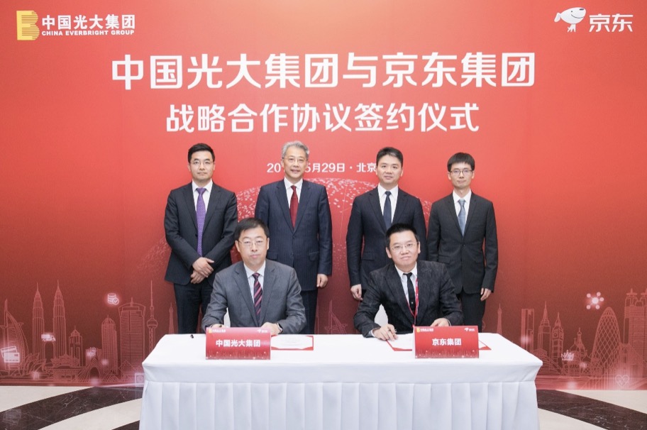据了解,中国光大集团和京东集团的合作将拓展至科技创新、健康、旅游、电商、物流、生态环保等方面,开展全方位战略合作。双方一致同意互为重要合作伙伴,共同建立新业务互推机制,共同探索商业模式创新。中国光大集团董事长李晓鹏、执行董事兼光大银行行长张金良、中国光大集团副总经理葛海蛟,京东集团董事局主席兼首席执行官刘强东,京东金融CEO陈生强、京东集团副总裁赵英明参与本次签约仪式。