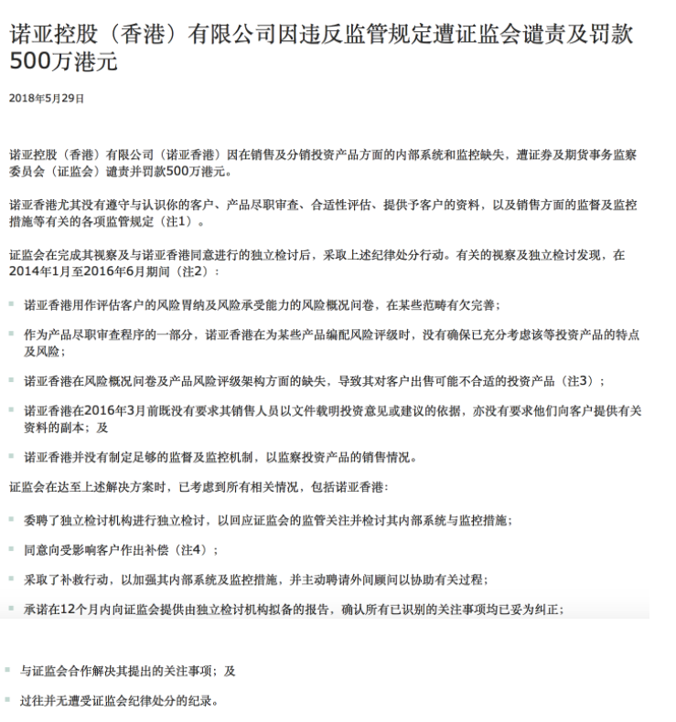 网络整理 2021-03-22 16:45近日,香港证监会发文称,诺亚控股(香港)有限公司(下称“诺亚香港”),因销售及分销投资产品方面的内部系统和监控缺失,遭谴责及罚款500万港币。