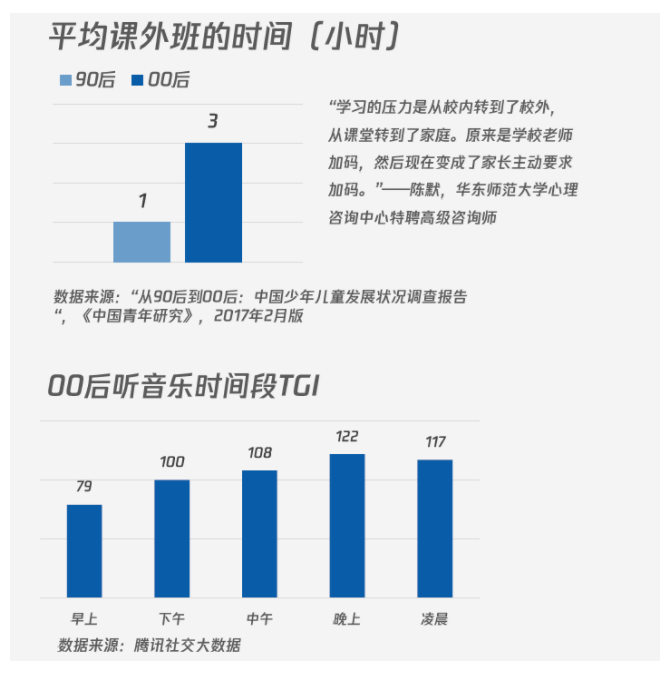 但是00后也经历着更重的课业负担。报告显示,00后参加课外培训班的时间是90后的2倍多,在繁重的课业压力下,他们的娱乐时间被集中压缩在晚上和凌晨。