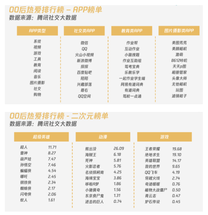腾讯社交大数据显示,00后最喜欢的社交类APP除了微信、QQ,还包括火山小视频、新浪微博、探探等;喜欢的教育类APP包括作业帮、互动作业、小猿搜题等;图片摄影类APP包括美图秀秀、美颜相机、激萌等。