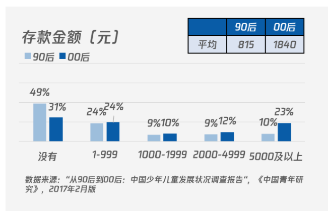 具体来看,00后平均存款金额达1840元,是90后的两倍多。00后家庭收入更高,他们当中有不少人从小就有出国经历。00后除了有更高的消费能力,还有更大的财务自主权。