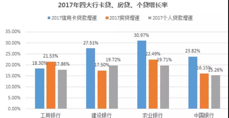 融360数据显示,在2017年,工行、建行、农行、中行的卡贷同比增速分别达到18.3%、27.51%、30.97%和23.82%,尽管不排除由于房贷受限、部分卡贷流向房地产市场,但是建行、农行、中行的卡贷增速仍然大幅领先于房贷和个贷增速。