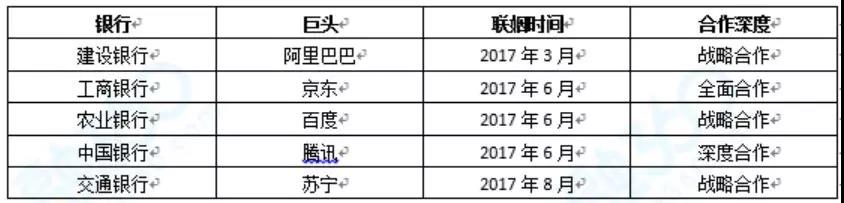 同时,各家银行也拥抱互联网金融巨头,开展资金、资源方面的合作。融360统计,工农建中交五大行在2017年上半年先后与BATJ联姻达成深度合作。
