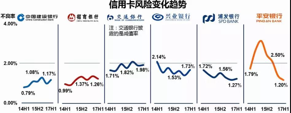 有第三方统计建行、招行、交行和兴业、浦发、平安银行自2014年一季度到2017年一季度的不良率发现,前三者的不良率平缓攀升,但是后三家银行的呈明显下降趋势。