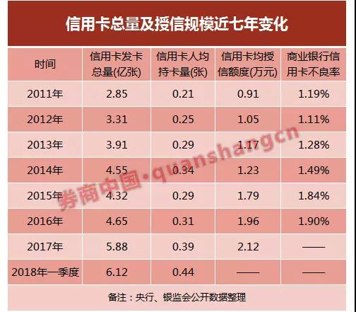 5月24日,央行发布的《2018年第一季度支付体系运行总体情况》显示,信用卡发卡数量共计6.12亿张,环比增长4.23%;全国人均持有信用卡0.44张,而在2017年末该数字是0.39张,增长势头强势。