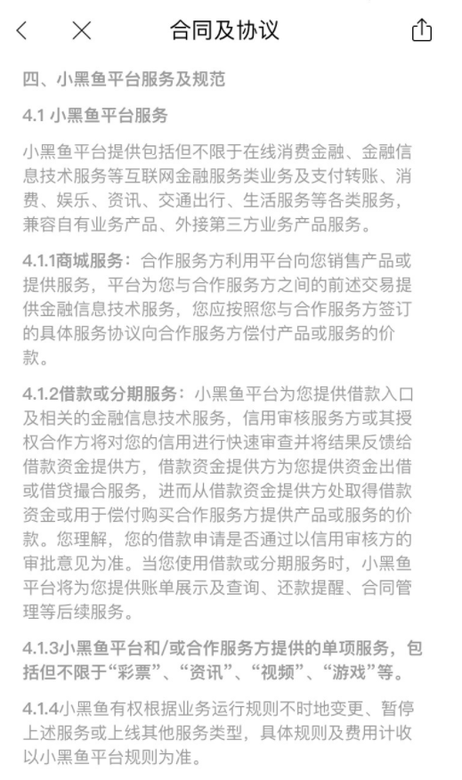 互联网金融新闻中心查看小黑鱼平台服务协议发现,该平台宣称提供包括但不限于在线消费金融、金融信息技术服务等互联网金融服务类业务及支付转账、消费、娱乐、资讯、交通出行、生活服务等各类服务,兼容自有业务产品、外接第三方业务产品服务。