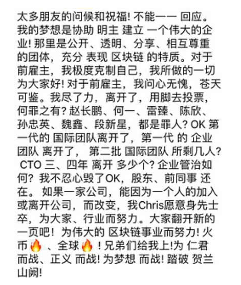 对于离开的原因,李书沸则表示:自己的梦想是协助明主建立一个伟大的企业!“对于前雇主,我极度克制自己,我所做的一切为大家好!对于前雇主,我问心无愧,苍天可鉴。我尽了力,离开了,用脚去投票,何罪之有?”言外之意,徐明星算不上“明主”,OKEx内部缺少了公开、透明、分享、相互尊重的工作环境。