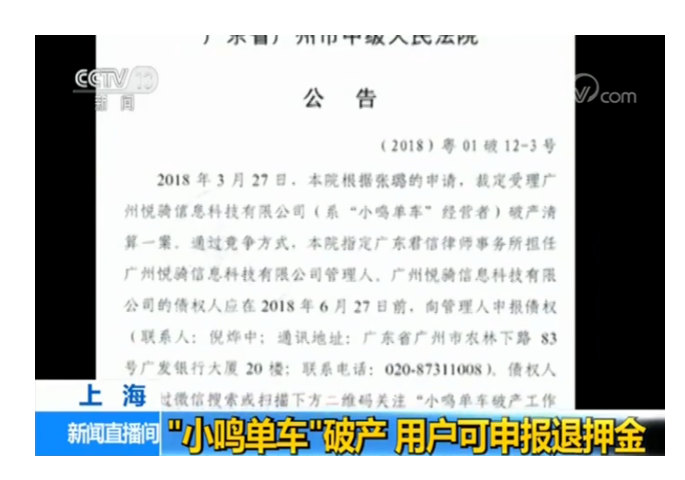 相比车辆的运营,不少用户最关心的还是自己的押金能否退还的问题。近日,根据广州市中级人民法院公告,小鸣单车的经营方悦骑信息科技有限公司破产清算一案已被法院受理,正式进入破产程序。