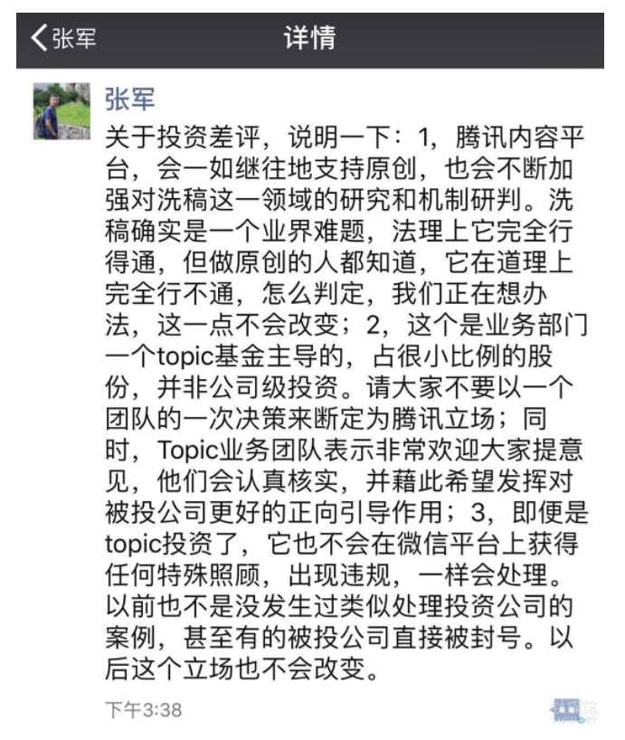 3,即便是topic投资了,它也不会在微信平台上获得任何特殊照顾,出现违规,一样会处理。以前也不是没发生过类似处理投资公司的案例,甚至有的被投公司直接被封号。以后这个立场也不会改变。