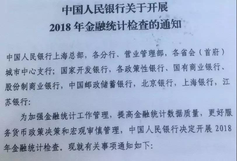 券商中国记者获取的央行所发《中国人民银行关于开展208年金融统计检查的通知》(以下简称《检查通知》)文件显示,央行为了加强金融统计工作管理,提高金融统计数据质量,更好的服务货币政策决策和宏观审慎管理,决定开展2018年金融统计检查。