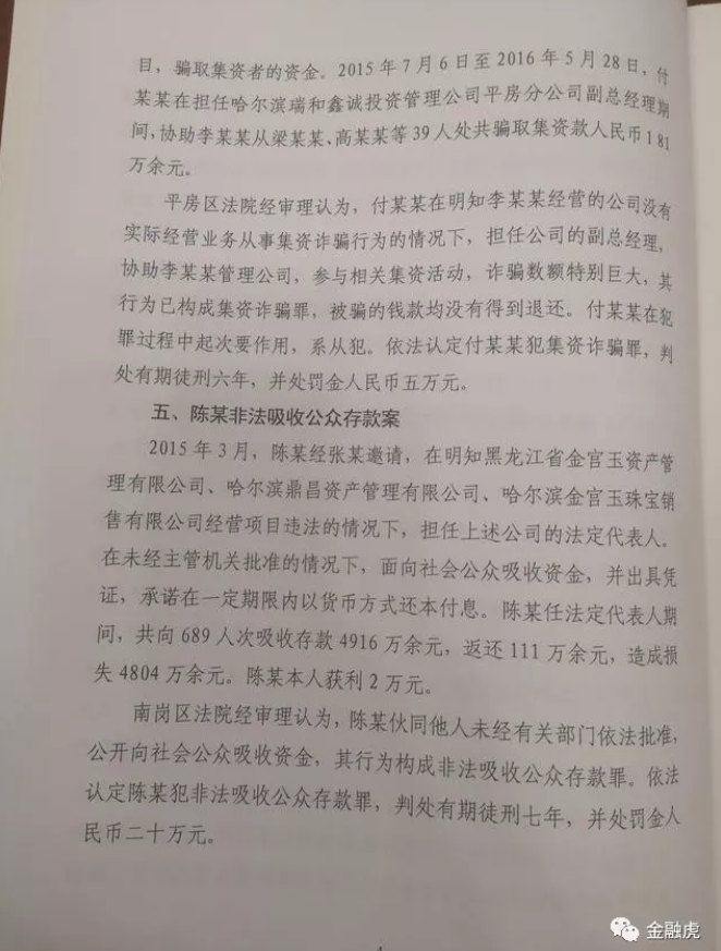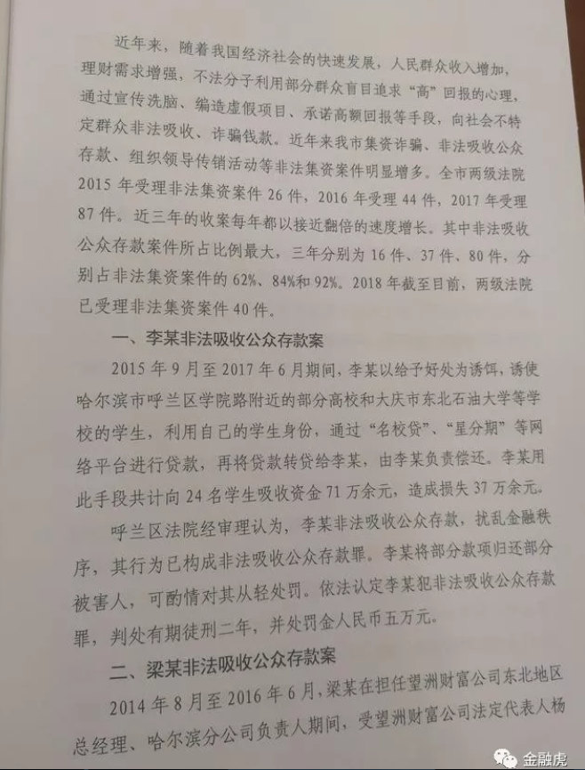 除望洲财富案外,哈尔滨市还公布了4起非法集资典型案例: