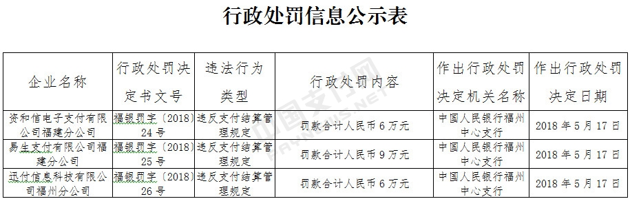 网络整理 2021-03-22 16:49中国人民银行福州中心支行上周四作出行政处罚决定,资和信电子支付有限公司福建分公司、易生支付有限公司福建分公司、迅付信息科技有限公司福州分公司等三家支付机构因“违反支付结算管理规定”,被分别给予罚款合计人民币6万元、9万元、6万元的行政处罚。