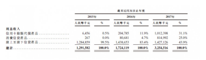 从其招股说明书来看,信用卡代偿业务比重近年来稳步上升,在2017年成为业务重心,占据了近6成的贷款实现量和3成的利息收入。2017年,维信金科经调整净利润为2.92亿元。