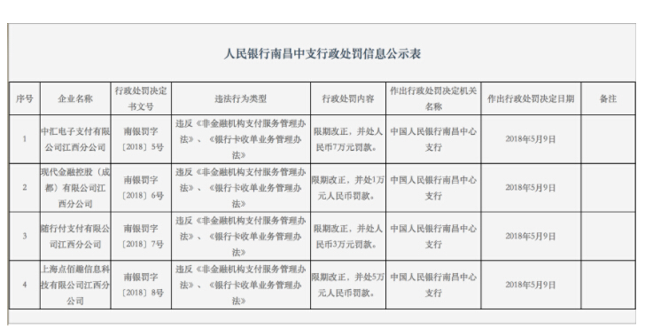 网络整理 2021-03-22 16:55近日,中国人民银行南昌中心支行公示四张支付罚单,中汇电子支付有限公司江西分公司(下称“中汇支付”)、现代金融控股(成都)有限公司江西分公司(下称“现代支付”)、随行付支付有限公司江西分公司(下称“随行付”)、上海点佰趣信息科技有限公司江西分公司(下称“点佰趣”)因违反《非金融机构支付服务管理办法》、《银行卡收单业务管理办法》被处以1万至7万不等的罚款,并被责令限期整改。作出行政处罚的决定日期是2018年5月9日。