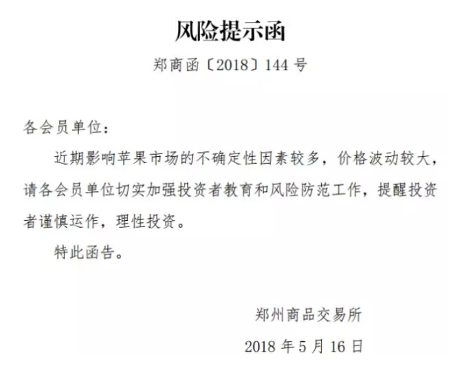 连续大幅上涨,成交持仓比超过10倍,面对这样的苹果期货市场,交易所又出手了。5月16日下午,郑商所首先发布《风险提示函》称,郑商所:近期影响苹果市场的不确定性因素较多,价格波动较大,请各会员单位切实加强投资者教育和风险防范工作,提醒投资者谨慎运作,理性投资。
