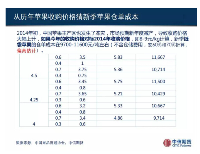 苹果期货价格未来会如何演变?对新季苹果价格进行预估是重要一环,再以此推算期货标准仓单和期货价格。高旺认为,14年也有倒春寒,导致价格比较高,如果对标14年8-9元/公斤,新季纸袋苹果的仓单成本在9700-11600元/吨左右(不含仓储费用)。
