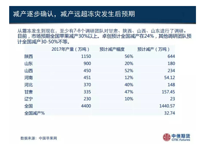 “最近一段时间苹果期货上涨是资金在炒天气,4月遭遇了霜冻,主产区减产面积比较大。这段时间一批批调研团过去,苹果座果开始,目前看减产要到3成以上。市场供需格局扭转。霜冻不仅影响了贫国产量,优果率进一步下降,本来符合期货交割品的数量就不是很多,市场担心可供交割量不足。同时,苹果产区的替代品、樱桃和梨也受到了天气影响。”东证期货分析师方慧玲指出。