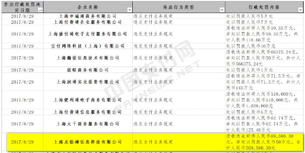此前,上海点佰趣信息科技有限公司黑龙江分公司因违反银行卡收单业务相关制度规定被处以2万元罚款。上海点佰趣信息科技有限公司被上海人行罚没近57万元。