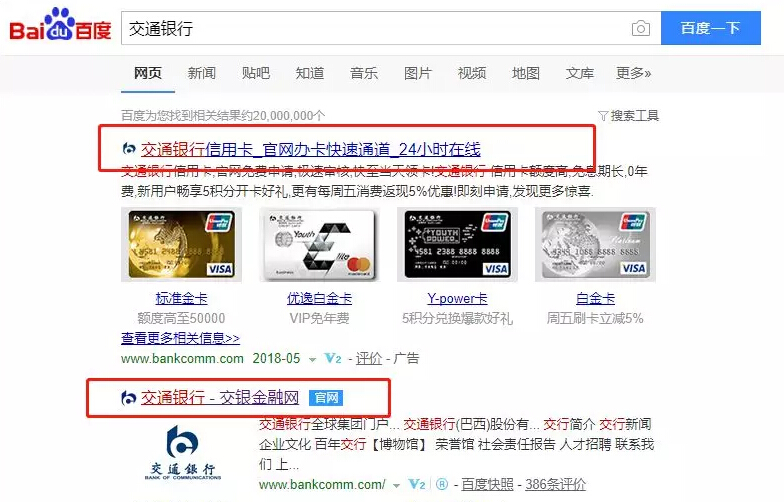 在百度搜索中信银行、交通银行,前两条也都是银行官方的信用卡申请网站,第三条起才是银行官网;其他银行则会直接在第一条显示银行官网。