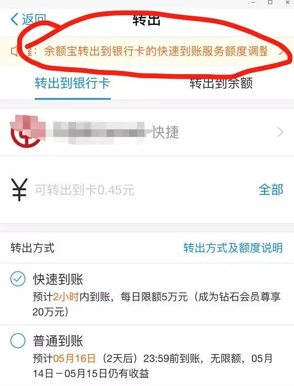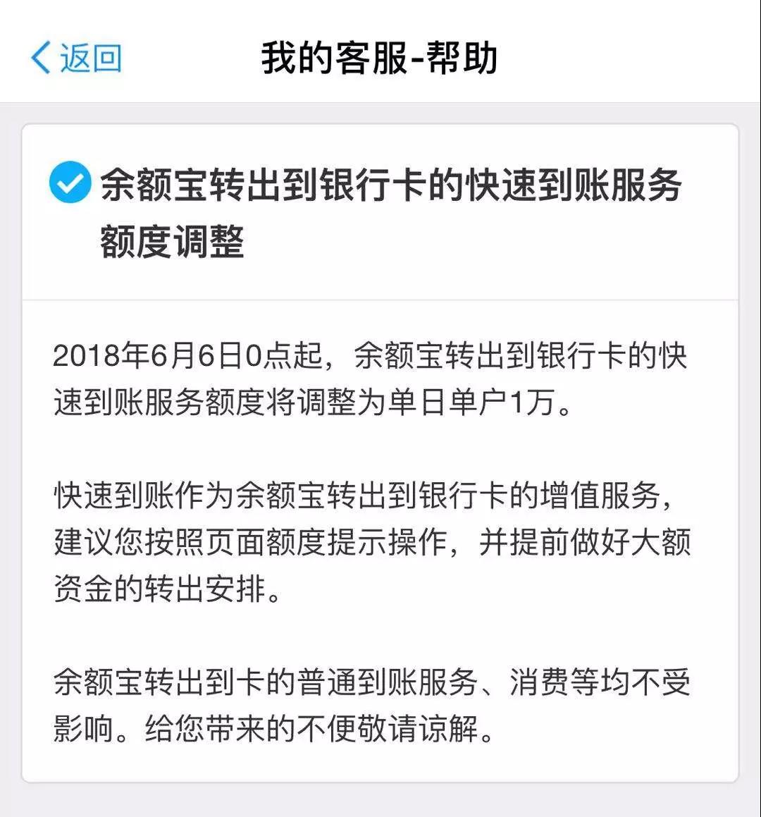 公告显示,从下个月也就是6月6日0点开始,余额宝转出到银行卡当日快速到账(也就是T+0)额度有所调整,从每日限额5万元调整到1万元,转出到银行卡普通到账服务(第二天到账额度)及消费支付等均不受影响。