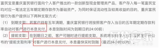 富民宝官网上有这段话:(2)提前支取:在到期日之前,客户可随时进行提前支取,系统将按照存入当日富民宝平台公布的“提前支取利率”对客户进行本息兑付,本息最快实时到账(最迟24小时以内)。