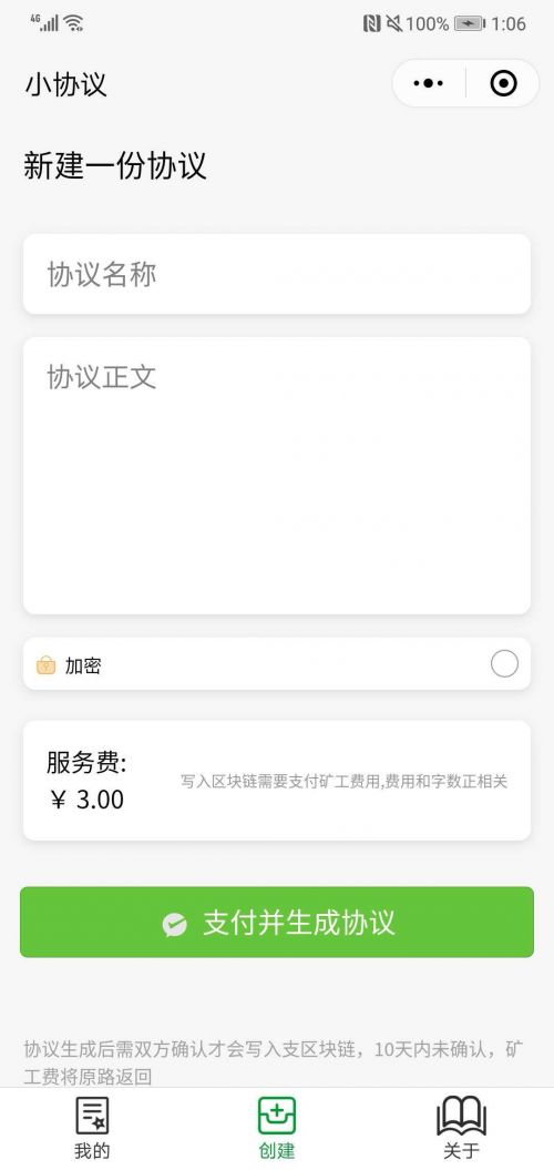 用户输入协议的标题和内容,可选择是否加密存储协议内容,需支付3块钱服务费(费用和字数正相关),生成协议,甲方将协议微信转发乙方,乙方同意之后,这份协议就会被写入以太坊网络。