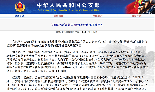 赵某等人潜逃后,公安部“猎狐行动”办公室通过国际刑警组织中国国家中心局申请发布红色通报。2017年6月,公安部通过外交渠道就上述6名逃犯向韩国司法主管机关提起引渡请求,并提供了扎实完备的证据。今年2月27日,韩方将姬某、温某、李某、董某、马某5人抓获,并随后启动引渡审理程序。5月1日,韩法院批准将姬某等5人引渡回中国。5月3日,公安部“猎狐行动”办公室会同河南公安机关迅速派出工作组赴韩,4日将5名逃犯押解回国。