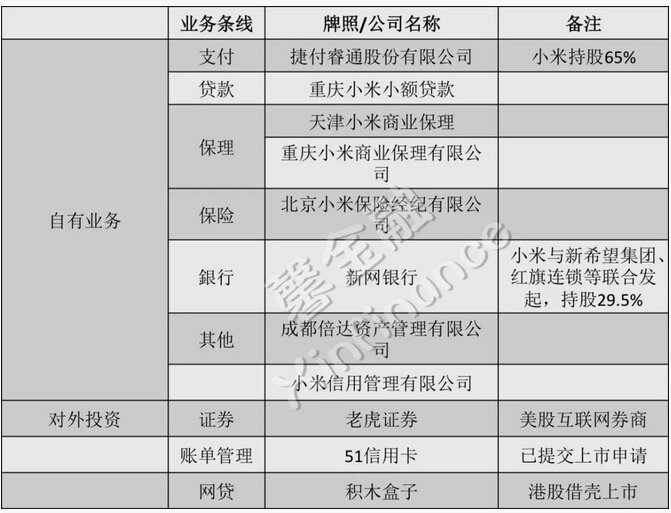 无论是价格一路水涨船高的第三方支付牌照,还是新金融行业分量最重的民营银行牌照都已经被小米收入囊中。另外,小米还布局了网络小贷、保险经纪、商业保理等牌照。