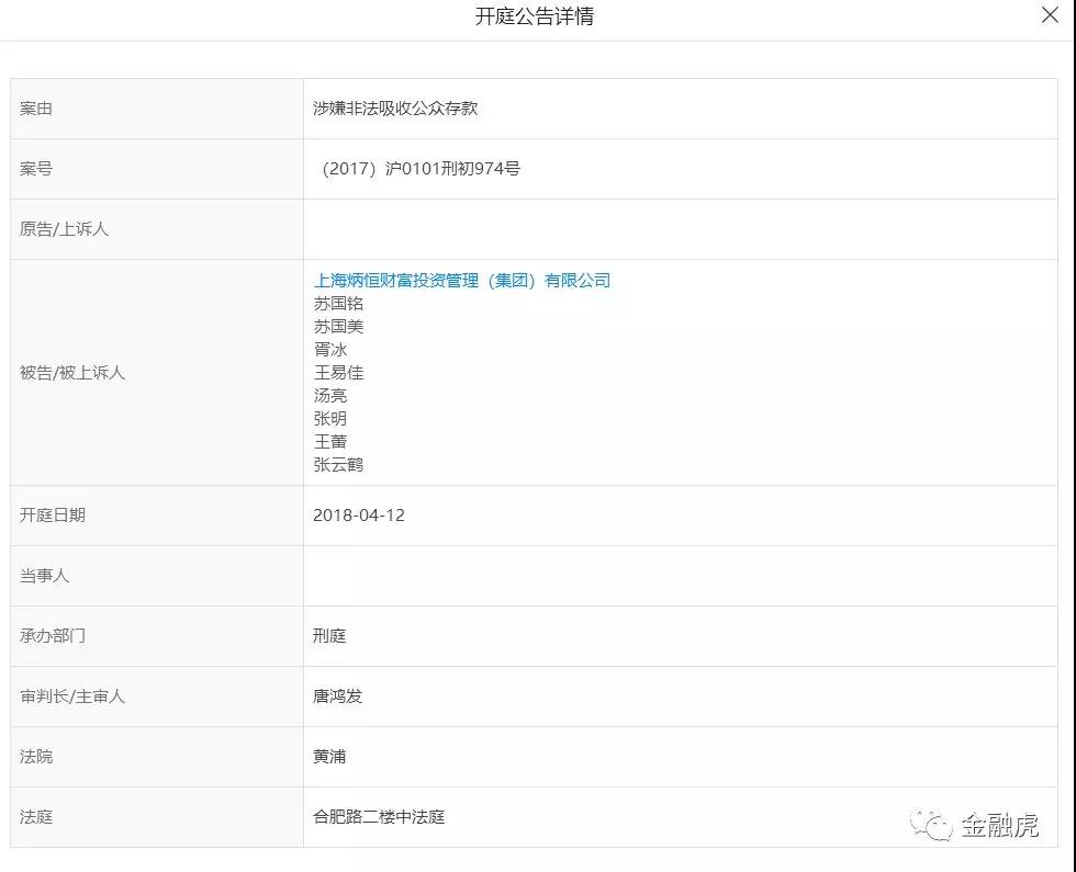 天眼查的消息显示,该案已于4月12日上午9点45分在上海市黄浦区人民法院开庭,炳恒集团以及苏国铭、苏国美、胥冰、王易佳、汤亮、张明、王蕾、张云鹤8人受审,案号为(2017)沪0101刑初974号。