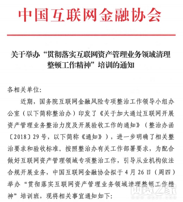 通知称,近期,国务院互联网金融风险专项整治工作领导小组办公室(以下简称整治办)印发了《关于加大通过互联网开展资产管理业务整治力度及开展验收工作的通知》(整治办函〔2018〕29号,以下简称《通知》),进一步明确了相关整治要求和验收标准。按照整治办有关工作部署要求,为配合做好互联网资产管理领域专项整治工作,引导从业机构依法合规开展业务,中国互联网金融协会拟于4月26日(周四)举办“贯彻落实互联网资产管理业务领域清理整顿工作精神”培训班,现将相关事宜通知如下: