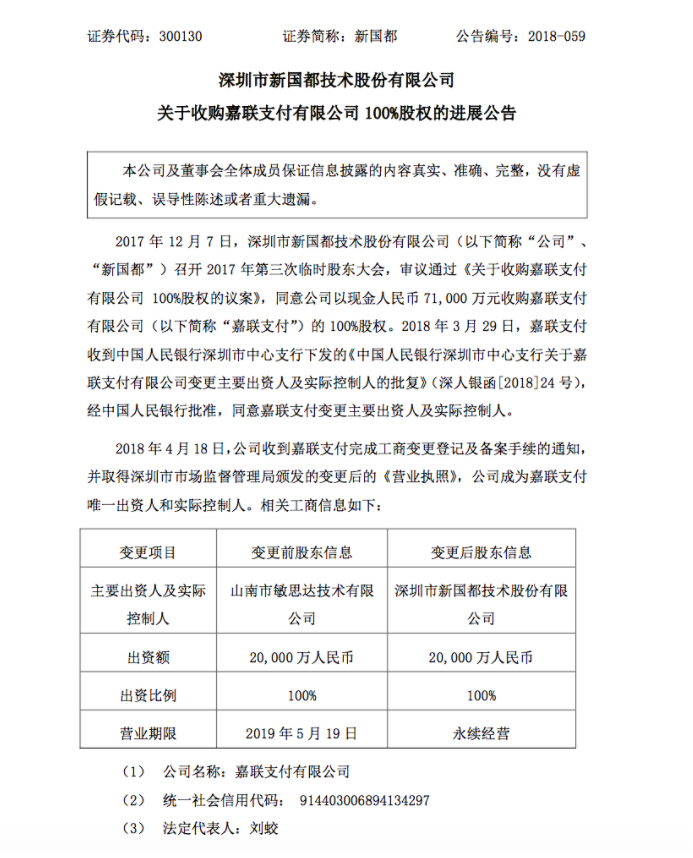 网络整理 2021-03-22 17:124月18日,新国都(300130)发布公告称,公司已于2018年4月18日收到嘉联支付完成工商变更登记及备案手续的通知,并取得深圳市市场监督管理局颁发的变更后的《营业执照》,公司成为嘉联支付唯一出资人和实际控制人。