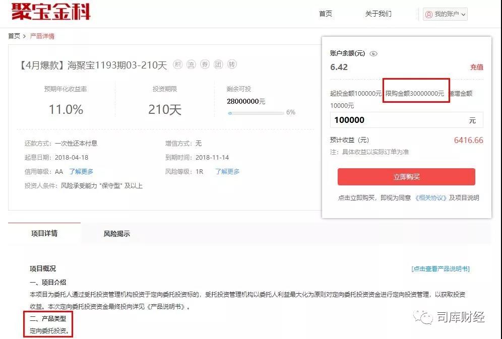 司库财经了解到,定向委托投资本质上是平台将资金投向包含信托收益权、资管计划等资产在内的非标固收市场,而根据聚宝匯平台的产品说明书,投资人资金最终投向有借款需求的企业。具体来看,“定向委托投资标的”是委托人通过受托投资管理机构投资于定向委托投资标的,受托投资管理机构以委托人利益最大化为原则对定向委托投资资金进行定向投资管理,以获取投资收益。