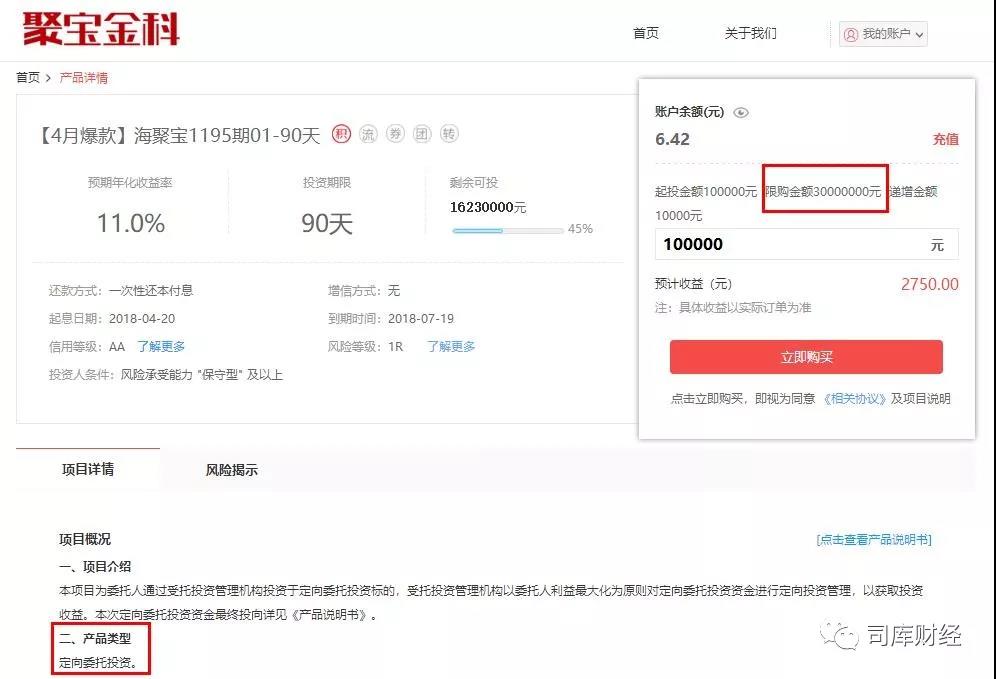 司库财经登录聚宝匯官网发现,截至发稿,聚宝金科仍然在销售海聚宝、海租宝、旅发宝等定向委托投资产品。以【4月爆款】海聚宝1193期03-210天和【4月爆款】海聚宝1195期01-90天为例,融资主体均为天津博昱企业管理有限公司,起投金额均为10万元,限购金额均为3000万元,合计6000万元。