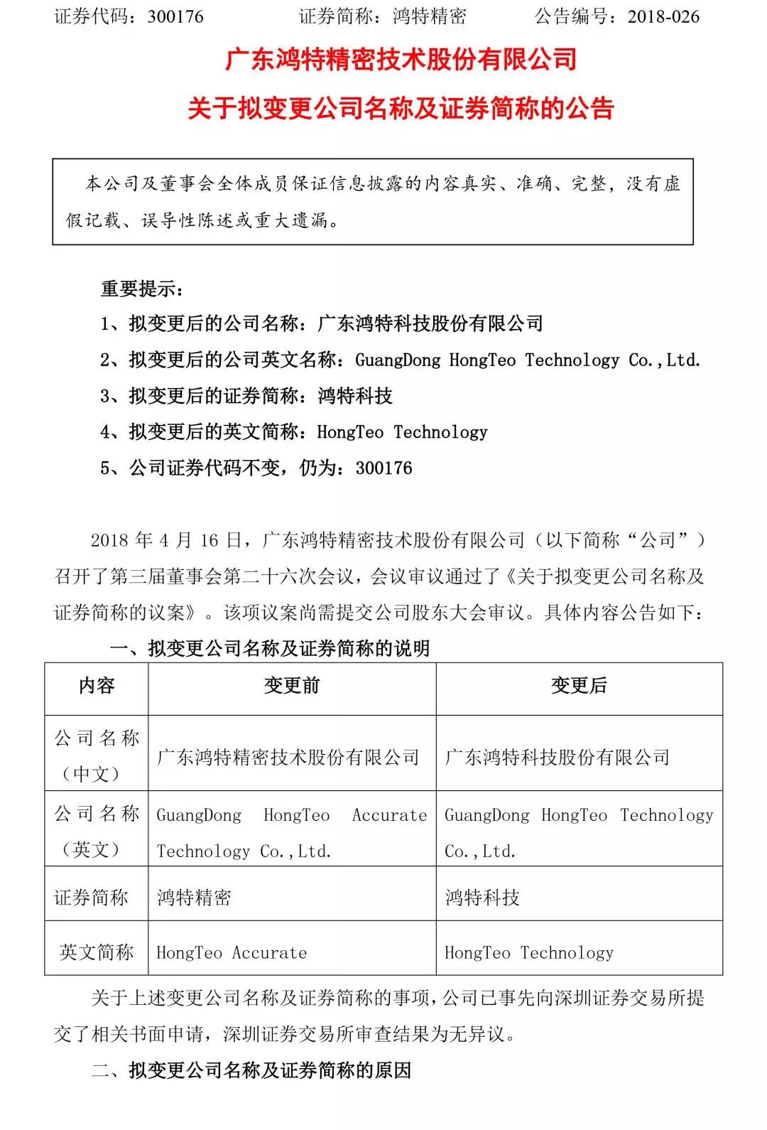 转载请标注:信息网——鸿特精密拟更名“鸿特科技” 准确反映业务模式