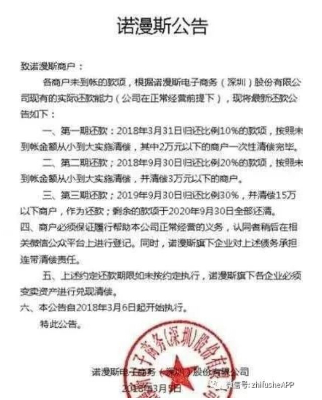 数名商户告诉记者,诺漫斯方面一直没有正面出来正式回应问题,商户M先生向记者出示他于去年12月底收到的一条诺漫斯的出款短信,上面称“将另发通知给大家关于第二批的出款”,不过,此后就了无音讯。今年3月5号,一份盖有诺漫斯电子商务(深圳)股份有限公司红头公章的公告显示:诺漫斯要到2020年9月30日才能全部还清欠款......