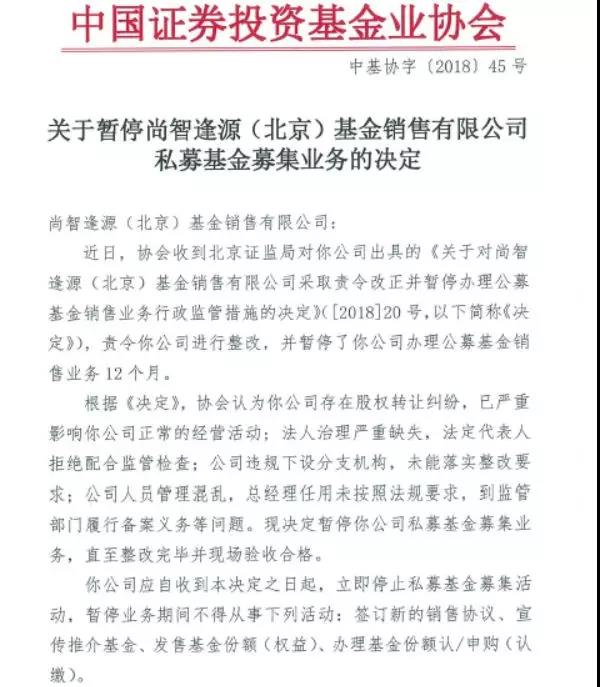 4月8日,中基协公告称,暂停尚智逢源私募基金募集业务。具体包括:立即停止私募基金募集活动,暂停业务期间不得从事下列活动:签订新的销售协议、宣传推介基金、发售基金份额(权益)、办理基金份额认/申购(认缴)。