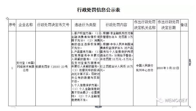 对于上述违规行为,中国人民银行杭州中心支行根据《非金融机构支付服务管理办法》,对支付宝处以罚款3万元。另据《中华人民共和国消费者权益保护法》,对产品宣传与个人信息保护两项违法行为,分别给予警告,并处罚款10万元、5万元,以上罚款合计人民币18万元。