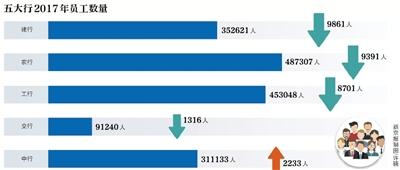 据新京报记者统计,2017年五大行员工较2016年减少2.7万人。其中建行员工减少近万人。