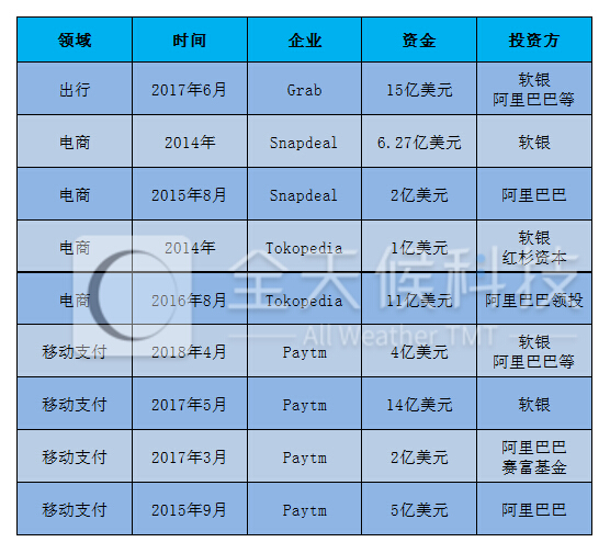 据不完全统计,软银与阿里巴巴在东南亚和印度市场投资了4家企业,主要集中在电商和移动支付领域,特别是印度“支付宝”——Paytm,软银对其投资已超10亿美元,阿里巴巴也已参与其多轮投资。