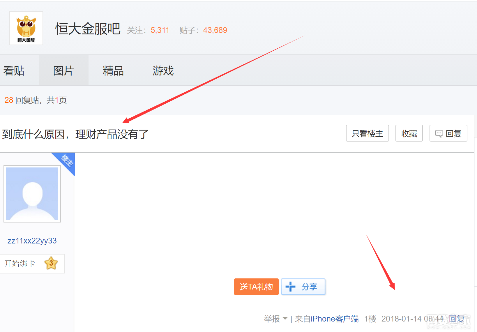 此外,在恒大金服贴吧中,也有多位网友反映其理财产品停发。其中较早的帖子是在2018年1月。