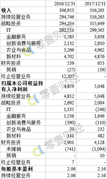 联想控股主要通过控股公司联想集团(0992.HK)开展IT服务。2017年,IT板块的收入同比上升6.0%至2,993.63亿元。但由于全球零件成本价格持续上升导致成本上市,以及没有政府颁布的减税与就业法案带来的递延所得税资产撇帐影响,联想集团2017年亏损6.7亿元。