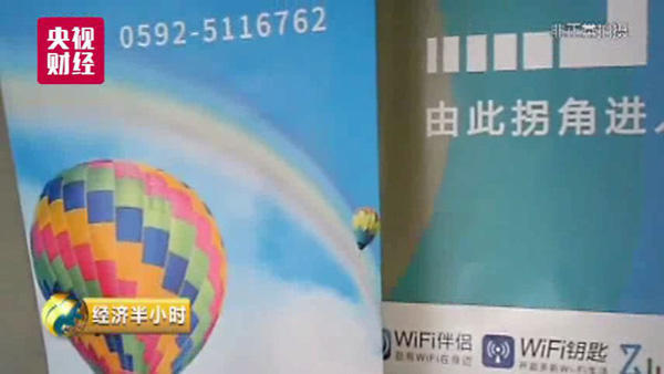 Wi-Fi钥匙明明在App里对外公布了客服电话,为什么是一个和它毫无瓜葛的第三方充值商家机构呢,那么这个Wi-Fi钥匙究竟是一家怎样的公司?记者根据Wi-Fi钥匙App对外公布的地址,找到了福建省厦门市软件园二期望海路14号楼之一101单元,刚进入望海路14号楼的大厅,我们就看到一个广告牌上面印着Wi-Fi钥匙由此进入的字样,当记者走进这家公司才发现,在它的前台打着众联世纪的牌子。